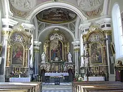 Der klassizistische Stuck und die Apostelzeichen schuf Josef Kinast 1827. Die Deckenfresken malte Josef Arnold der Ältere, die Chorkuppel Geburt Christi 1827, in den Pendentifs Grisaillemedaillons mit den Vier Propheten, in der Hauptkuppel Darstellung im Tempel 1828, in den Pendentifs Grisaillemedaillons Anbetung der Könige, Jesus lehrt im Tempel, die Vier Evangelisten, im Vorjoch Verkündigung, südlich im Langhaus Kreuzigung 1827/1828.