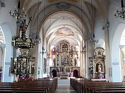 Der neubarocke Hochaltar entstand 1874. Die Altäre an den Langhauspfeilern von 1766 schuf Matthias Götz. Eine spätgotische Statue mit Kind von 1500 wurde später überarbeitet. Die Kanzel entstand um 1700.