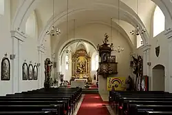 Das Langhaus aus dem 18. Jahrhundert ist stichkappentonnengewölbt und lagert zwischen Doppelgurtbögen. Diese ruhen wiederum auf Doppelpilastern. Im Westen des Kirchenschiffes ist eine dreischiffige kreuzgratunterwölbte Orgelempore. Ein eingezogener rundbogiger Triumphbogen trennt das Langschiff vom einjochigen Chor, der kreuzrippengewölbt ist. Die Schlusssteine sind skulptiert. Eine Skulptur stellt einen Christuskopf, die anderen Rosetten dar. Zwei Konsolsteine weisen Blattdekor auf, die spitzbogige Sakramentsnische ist mit Maßwerk dekoriert. In der Südwand des Chores ist ein Portal mit Schulterbogenportal, das zum kreuzrippengewölbten Turmerdgeschoß führt.