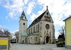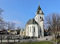 Von der ursprünglichen Kirche ist nur mehr der wuchtige Wehrturm und das Presbyterium, vermutlich Ende des 14. Jahrhunderts[3] /Anfang des 15. Jahrhunderts,[4] erhalten. 1892 gründete sich ein Kirchenbaukomitee zur Erweiterung der Kirche.[4] Ab 1897 erfolgte der Umbau nach den Plänen des Architekten Eugen Schweigl (1842–1929)[5], bei dem das alte Langhaus abgetragen und durch ein neues, größeres ersetzt wurde. Im Zuge dieses Umbaus, der mit der Weihe am 22. Dezember 1901 abgeschlossen war, wurde auch die unter Denkmalschutz stehende Aufbahrungshalle, südwestlich der Kirche, errichtet.[3]