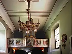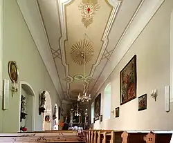 Das Kirchenschiff ist ein langgestreckter Saal mit einem Dreiachtelschluss. Die Seitenkapelle ist mit zwei Bogenöffnungen mit dem Schiff verbunden. Saal wie Seitenkapelle haben Flachdecken. Die Empore ist aus Holz.
