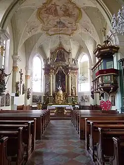 Der leicht eingezogene weiträumige zweijochige gotische Chor schließt mit einem Dreiachtelschluss, die Gewölberippen wurden entfernt. Das vierjochige muldengewölbte Langhaus hat Pilaster mit Kapitellen mit Stil des Rokoko. Der Rokoko-Stuck in den Gewölben des Chores und Langhauses zeigt sich mit Puttengruppen. Die dreiachsige zweigeschoßige Westempore zeigt in der unteren Brüstung eingelassene Apostelbilder aus der zweiten Hälfte des 17. Jahrhunderts. Der eingebaute Westturm wurde oben in ein Achteck übergeführt und trägt einen Zwiebelhelm, die Glockenstube hat ein Sternrippengewölbe. Der Sakristeianbau im südlichen Chorwinkel hat ein Sternrippengewölbe. Das Südportal ist gotisch. Die Türe des Westportals hat gotische Beschläge.