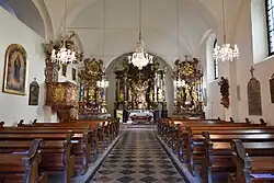 Das Kircheninnere zeigt ein Langhaus mit drei kreuzgratgewölbten querrechteckigen Jochen mit Gurten auf flachen Wandpfeilern. An der Nordseite des Langhauses wurde im Ende des 18. Jahrhunderts ein seitenschiffartiger Anbau mit darüberliegenden zum Langhaus geöffneten Emporen angebaut. Die lebhaft geschwungene Orgelempore steht auf zwei Säulen, die Brüstung zeigt eine reiche Stuckierung aus dem dritten Viertel des 18. Jahrhunderts. Der gering eingezogene einjochige Rechteckchor hat nordseitig die Sakristei und eine Empore.