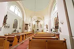 Über dem Langhaus ist eine Pendentifkuppel über einem Gesims, das auf pilastergegliederten Pfeilern lagert. Im westlichen Langhausjoch ist Platzlgewölbe. Unterhalb der Orgelempore ist eine Flachdecke, die durch Putzfelder gegliedert ist. Der zweijochige Chor ist platzlgewölbt, in der Sakristei ist zwischen Gurtbögen ebenfalls ein Platzlgewölbe.