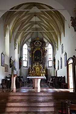 Das Kircheninnere zeigt ein breites tonnengewölbtes Langhaus aus 1653, vorher war eine Flachdecke. Die dreiachsige Westempore ist kreuzgratunterwölbt. Der langgestreckte dreieinhalbjochige Chor hat einen Fünfachtelschluss und ein unregelmäßiges Vierrautensterngewölbe, im Chorschluss auf Halbkreisdiensten und sonst teils auf Schildkonsolen, ein Schlussstein zeigt das Wappen von Pfarrer Andreas Wartenauer (1473–1500). Die Seitenwände des Chores sind aus erhaltenem romanischem Quadermauerwerk, ein romanisches Fenster in der Südwand ist vermauert.