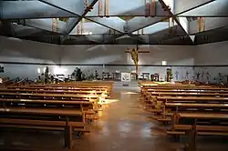 Der Zentralbau mit gestaffelten Oberlichtfenstern hat seitlich angebaute niedrige Anbauten. Der Saalraum mit einem Grundriss als unregelmäßiges Sechseck hat eine Dachkonstruktion aus Beton. Der Altarraum und der Altarblock ist sechseckig. Die Empore wurde über zwei Freitreppen erschlossen.