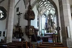 Das dreischiffige, fünfjochige Langhaus ist 18 Meter lang, 13 Meter und in der Mitte 9 Meter hoch. Das Mittelschiff deckt ein Netzrippengewölbe, die beiden Seitenschiffe tragen steigende Kreuzrippengewölbe. Getrennt sind sie durch zwei Reihen von je vier achteckigen Pfeilern. Durch die zwei westlichen Joche des Hauptschiffes zieht sich die Empore mit einer schön verzierten Brustwehr. In den westlichen Enden der Nebenschiffe ist je eine Wendeltreppe mit 19 Stufen angelegt, die auf die Empore führen.