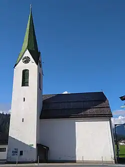 Der barocke Kirchenbau ist im Kern im Mauerwerk erhalten, das ehemalige Langhaus wurde in Richtung Altarraum mit einer flachen Holzdecke und Betonwandpfeilern versehen und an der Westwand mit Betonglasfenstern vom Maler Josef Widmoser umgestaltet. Der ehemalige rund schließende Chor dient heute als Sakristei. Der Turm mit einem Giebelspitzhelm aus 1928 steht an der Nordseite des Chores.