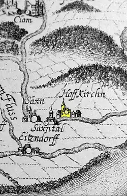 Die erste namentliche Erwähnung als „Hofkirchen“ erfolgte um 1230, als es einen Streit zwischen dem Pfarrer von Saxen und dem Vogt des Stiftes Sankt Nikola um die Grenzen und Rechte der capella in hofchirchen ging.[4][5]