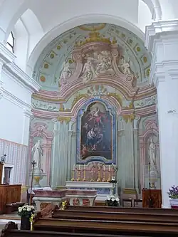 Die Apsis zeigt eine die Gliederung weiterführende illusionistische Architekturmalerei aus der Mitte des 18. Jahrhunderts und eine rundbogig geschlossene Altarblattrahmung mit der Dreifaltigkeit in einem Aufsatz unter einem Baldachin und in seitlichen Nischen die gemalten Statuen der Heiligen Benedikt und Scholastika, die Kalotte ist kassettiert.