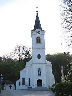 Die Kirche ist eine klassizistische einschiffige Kirche mit halbrunder Apsis. Der vorgelagerte Ostturm mit Spitzhelm ist dreigeschoßig. Am Ostjoch ist ein Strebepfeilerpaar. Über dem Turmportal ist eine Nische mit einer Steinfigur des heiligen Johannes Nepomuk.
