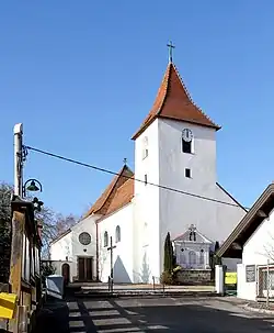 Das moderne breite rechteckige Langhaus aus 1947/1951 unter einem Schopfwalmdach zeigt sich mit glatten Fassaden und Kreis- und Rundbogenfenstern, im Westen befindet sich ein eingezogener Bereich mit einem geraden Schluss unter einem Satteldach.