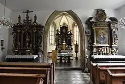 Der Hochaltar aus dem Ende des 17. Jahrhunderts beinhaltet ältere Knorpelwerkwangen.