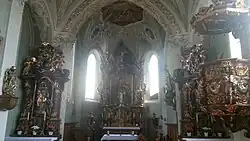 Der Hochaltar und Tabernakel aus 1843 in barocken Formen zeigt das Altarblatt Glorie des Stephanus des Malers Josef Arnold (1828) und trägt die Statuen Katharina und Barbara des Bildhauers Franz Xaver Renn. Die Seitenaltäre aus der Mitte des 18. Jahrhunderts tragen die Figuren Anna und Josef aus dem 19. Jahrhundert. Die Kanzel von 1843 mit reichem Rankenschnitzwerk und Evangelistenreliefs trägt auf dem Schalldeckel die Statue Michael vom Bildhauer Andreas Kölle aus dem 2. Viertel des 18. Jahrhunderts. Die Pietà ist aus dem Ende des 17. Jahrhunderts.