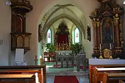 Der Hochaltar aus dem Anfang des 18. Jahrhunderts zeigt das Mittelbild hl. Ulrich und das Aufsatzbild Hl. Dreifaltigkeit. Der Seitenaltar aus der Mitte des 18. Jahrhunderts zeigt das Mittelbild Maria Immaculata und das Aufsatzbild hl. Barbara.