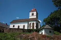 Der romanische Kirchenbau mit einem spätgotischen Chor und einem gotischen Nordturm ist von einem ummauerten Kirchhof umgeben. Außen an der östlichen Chorwand befindet sich eine fialengerahmte gotische Totenleuchte. In der Friedhofsmauer sind Reste einer ehemaligen spätgotischen Wehranlage erhalten. Unter der Umfassungsmauer südlich des Chores befindet sich eine einfache Kapelle, die eine Quelle beinhaltet.