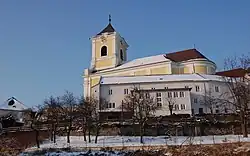 Das mächtige Langhaus hat einen eingestellten Westturm und einen eingezogenen halbrund geschlossenen Chor. Beidseits des Chores bestehen zweigeschoßige Anbauten unter einem Pultdach. Die Putzgliederung zeigt sich streng spätbarock durch Lisenen und eingezogenen Rundbögen. Die Fenster sind rechteckig und rundbogig. Die Westfassade mit einer davor angestellten Freitreppe hat eine mittige Portal-Fenster-Gruppe und eine tempelartige Gliederung mit Riesenpilastern und einem mächtigen Dreieckgiebel mit einem darüberliegenden Turmschallgeschoß mit Eckpilastern und rundbogigen Schallfenstern. Der Turm trägt ein Pyramidendach aus 1826. Seitlich des Portales sind rundbogige Nischen mit den Statuen der Heiligen Augustinus und Ambrosius. Das Rechteckportal hat ein schmiedeeisernes Oberlichtgitter und barocke hölzerne Türflügel mit Felderung und originalen Beschlägen.