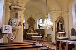 Der Hoch- und Seitenaltar sind neuromanisch und wurden 1896 von der Firma Heckenast in Szombathely geschaffen. Die Kanzel stammt aus dem 19. Jahrhundert und weist vier Sitzfiguren der Evangelisten auf. Das Taufbecken mit plastischer Täufergruppe ist aus dem 19. Jahrhundert. Zwei Holzfiguren in alter Fassung stellen eine Madonna mit Kind und den heiligen Johannes Nepomuk dar. Die Madonnenfigur stammt aus der Zeit um 1700, die Figur des heiligen Johannes Nepomuk aus der ersten Hälfte des 18. Jahrhunderts. Sie stehen am Triumphbogen.