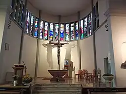 Rückansicht der Kirche mit der 1956 errichteten Apsis -