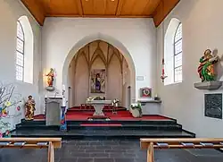 An der Chorstirnwand hängt ein Kruzifix vom Bildhauer Erasmus Kern um 1640. Volksaltar, Ambo und Taufstein schuf Deutschmann (1971). Den Tabernakel und die Osterleuchter mit Mosaik schuf Konrad Honold (1971).