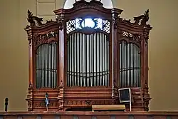Die Kirche ist ein basilikaler Bau mit halbrunder Eingangshalle und gerade schließendem Chor.