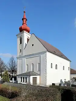 Der ungegliederte frühbarocke Kirchenbau ist von einem Friedhof umgeben.