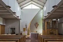 Die Kirche mit einem freistehenden Campanile ist an einer dreischiffigen Basilika orientiert. Das Mittelschiff hat einen offenen Dachstuhl und wird durch ein Dreiecksfenster im Giebel an der Altarseite sowie zwei Okuli im Obergaden beleuchtet.