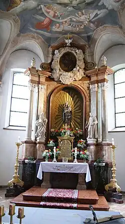 Der Hochaltar wurde 1686 gestiftet und bis 1719 von Salzburger Künstlern vollständig vollendet. Die zwei Seitenaltäre wurden 1637 errichtet und 1845 restauriert. Dabei wurden sie verändert. Der nördliche Altar wurde im Jahr 1951 restauriert. Die Kanzel stammt aus dem Jahr 1737, der Altar der Seitenkapelle von 1707. Das schmiedeeiserne Eingangsgitter stammt vom Ende des 17. Jahrhunderts.