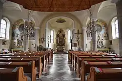 Das dreischiffige und vierjochige Langhaus wird von einem auf Achteckpfeilern ruhenden Platzlgewölbe überspannt und stammt in seiner heutigen Form aus dem Jahr 1877. Der im Kern gotische Chor mit Flachtonne hat einen Dreiachtelschluss. Im westlichen Teil des Langhauses befindet sich eine durch alle drei Kirchenschiffe verlaufende und im Mittelschiff vorkragende Empore. Nördlich des Chores befindet sich die im 17. Jahrhundert angebaute, barocke Sakristei. Südlich schließt die Grabkapelle der Grafen von Saurau an den Chor an. Diese ist klostergewölbt und steht über einer im Jahr 1861 angelegten Gruft der Adelsfamilie. Mitglieder der Familie wurden bereits zuvor in Ligist beigesetzt und man findet mehrere ihrer kupfernen und mit gestochenen Inschriften versehenen Sargplatten aus dem 17. bis 19. Jahrhundert.[3]