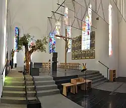 Die liturgischen Orte wurden beim Umbau neu gestaltet. Das Taufbecken wurde ein Brunnen, von dem bei einer Taufe Wasser zu einem echten Ölbaum aus Spanien fließt. Der Ölbaum verweist auf den Weg Jesu durch Jerusalem zum Ölberg. Der quadratische Altarblock besteht aus zwölf regionalen Gesteinsarten, die auf die zwölf Apostel verweisen sollen, der Ambo aus vier Gesteinsarten, ebenfalls aus der Region, als Verweis auf die vier Evangelisten. Der Kreuzweg wird als Weg durch Markierungen im Boden und durch abgehängte Fahnen auch als Tragrahmen für Licht und Medien in den ganzen Langhausraum gezogen und endet bei einem großen freistehenden Kreuz im Chorraum. Zusätzlich sind die historischen 14 Kreuzwegbilder aus dem 19. Jahrhundert konzentriert um eines der Chorfenster gruppiert. Eine Säule mit dem Tabernakel ist ebenfalls im Chorraum aufgestellt, ebenso eine Marienstatue aus dem 18. Jahrhundert. Kreuzwegbilder und Marienstatue waren schon vor der Umgestaltung Teil der Kirchenausstattung.