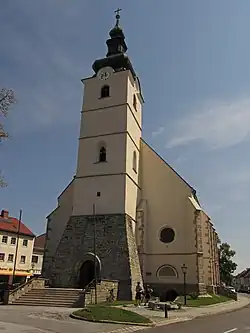 Die Pfarrkirche Litschau inmitten des Stadtplatzes ist in ihren meisten Anteilen eine spätgotische dreischiffige Hallenkirche mit Kreuzrippengewölbe und einem Turm im Westen, welcher mit einem Zwiebelhelm bekrönt ist. Der quadratische Turm aus dem 14. Jahrhundert wurde im 16. und 17. Jahrhundert umgebaut, erhöht und barock abgeschlossen. Das Sockelgeschoß wurde im Jahr 1881 durch eine Bruchsteinböschung ummantelt, nachdem der Kirchenplatz eingeebnet und dadurch die Statik des Turmes gefährdet worden war (um 1950 erneuert). Der Turm weist sowohl mittelalterliche Maßwerkfenster als auch barocke rundbogige Schallfenster auf. Im Erdgeschoß des Turmes findet sich ein Kreuzrippengewölbe über vier Evangelistensymbolen auf Konsolen aus der zweiten Hälfte des 14. Jahrhunderts; der runde Schlussstein trägt ein Christuskopf-Relief. Der Zugang zum Kirchenschiff erfolgt über ein profiliertes Spitzbogenportal. Das fünfjochige, kreuzrippengewölbte Langhaus, eine weite, dreischiffige Staffelhalle aus dem 15. Jahrhundert, steht auf einem geländeausgleichenden Sockel, hat achtseitige Strebepfeiler, ein umlaufendes Kaffgesims sowie zwei- und dreibahnige Maßwerkfenster. Im dritten Joch findet sich nordseitig ein profiliertes Kragsturzportal, südseitig ein profiliertes Spitzbogenportal. Der Chor, höher als das Mittelschiff, entstand vor 1380, ist zweijochig und mit einem 5-Achtel-Schluss und zweibahnigen Maßwerkfenstern versehen. Im Westen finden sich Gewände von frühgotischen Spitzbogenfenstern mit Dreipassfüllung vom Vorgängerbau. Die Sakramentsnische und die Sitznische (mit zwei Dreipassbögen) stammen wahrscheinlich aus der ersten Hälfte des 15. Jahrhunderts. Die östlichen Seitenschiffjoche sind als 4-Sechstel-Schlüsse ausgebildet. Im südlichen Seitenschiff wurde eine romanische Kopfkonsole eingemauert. Die Orgelempore ist von Kreuzrippen unterwölbt.[24]