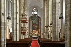 Nach 69-jähriger Bauzeit war die Kirche im Jahr 1523 fertiggestellt. Sechs Jahre später, im Jahr 1529, wurde sie im Osmanenkrieg niedergebrannt. Aus der Zeit vor der Zerstörung sind, außer Mauern und Säulen, das Sakramentshäuschen, der Kopf des Gekreuzigten am großen Kreuz und ein gesticktes Marienbild (heute beim Votivaltar) erhalten geblieben.