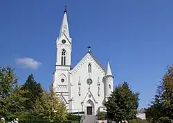 Der neogotische Kirchenbau ist groß und hat einen Turm.