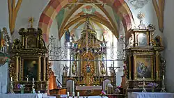 Im vierjochigen Langhaus erhebt sich ein Netzrippengewölbe über halbrunden Wandvorlagen. Die runden und quadratischen Schlusssteine sind mit Wappen geschmückt. Zwei rundbogige Öffnungen aus der Barockzeit führen von den beiden mittleren Langhausjochen in querhausartige Seitenkapellen. Die nördliche Kapelle mit einem dreijochigen Netzrippengewölbe besitzt einen Emporeneinbau auf Pfeilern, die südliche hat ein vermutlich 1661 errichtetes, barockes Stichtonnengewölbe. Die spätgotische, eisenbeschlagene Tür in der Nordwand des östlichen Langhausjoches führt in die Sakristei im Turmerdgeschoß. Ein eingezogener, spitzbogiger Triumphbogen verbindet das Langhaus mit dem Chor. In der Triumphbogenöffnung hat sich der obere Teil des barocken Chorgitters mit einer volkstümlichen Kreuzigungsgruppe erhalten. Der Chor mit einem quadratischen Joch und Fünfachtelschluss ist kreuzrippengewölbt.