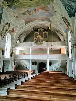 1758/59 erfolgte die Barockisierung der Kirche unter dem kaiserlichen Hofmaler Josef Adam Mölk. Dabei baute man das Kirchenschiff, welches man nach Westen erweiterte, zu einer Saalkirche mit Tonnengewölbe um. Im Gewölbe kann man dennoch die ursprünglich gotische Form erkennen. Auch die Außenwände, in die man zwei Konchen brach, werden immer noch durch eine Art Strebepfeiler gegliedert.[4]
