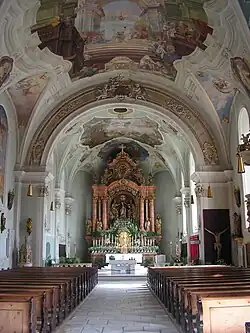 Durch den Verzicht auf den im Barock üblichen Stuck konnte Mölk Platz für großflächige Fresken schaffen. Im Langhaus malte er die biblische Esther, vor dem Perserkönig Xerxes I. kniend, inmitten einer riesigen gemalten Scheinarchitektur. Auch im Chor gibt es ein großes Bild, das von mehreren kleineren Malereien in den Feldern des Gewölbes umrahmt wird. Es stellt die Verehrung Mariens durch die Erdteile dar. Europa trägt die Züge der damals herrschenden Kaiserin Maria Theresia.[6]