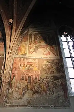 Rechts vom Schmerzensmann beginnt mit der Verkündigung an Maria ein Bilderzyklus mit Szenen aus dem Leben Mariens und der Kindheit Jesu. Im Uhrzeigersinn folgen die Geburt Jesu, die Verkündigung an die Hirten und die Anbetung durch die hl. drei Könige. An der gegenüberliegenden Seite, an der Nordwand des ersten Chorjoches, werden die Szenen mit der Flucht nach Ägypten fortgesetzt. Es folgen die Heimkehr aus Ägypten und eine Darstellung von Anna mit Jesus und Maria. Seinen Abschluss findet der Zyklus mit der Szene des zwölfjährigen Jesus im Tempel links vom Schmerzensmann.