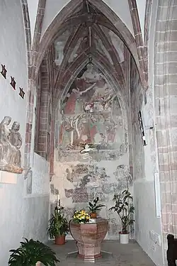 Die Fresken im Chor der Pfarrkirche entstanden in zwei Arbeitsphasen. Aus der ersten Phase, kurz nach der Fertigstellung des Chorraumes (um 1367), stammen die nur noch fragmentarisch erhaltenen Bildnisse der zwölf Apostel unterhalb der Fenster des Chorabschlusses und der von den Evangelistensymbolen gerahmte Pantokrator in Regenbogenmandorla im Gewölbe.