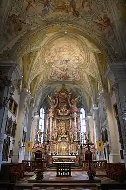Den Hochaltar aus 1753 baute Veit Häusl, er trägt mittig die Figur Maria mit Kind aus 1470/1480 und die Figuren Hll. Katharina und Barbara und über den Opfergangsportalen die Figuren der Hll. Simon Stock und Theresia vom Bildhauer Daniel Mayr, das Oberbild Gottvater malte Georg Kreuzer 1753.