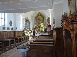 Das einschiffige Langhaus schließt mit einem Rechteckchor ab, an dem ein schlanker Chorturm, mit achteckigem Aufsatz und barocker Haube angebaut ist. Der Innenraum ist im Stil des Spätbarock bis Frühklassizismus gehalten. Das Hochaltarblatt mit der Darstellung der Himmelfahrt Mariens schuf der Tiroler Maler Christoph Unterberger.[5][6] Die Bilder der Seitenaltäre zeigen die Kreuzigung Christi und die Darstellung des Herren. Die Orgel wurde 1750 vom Tiroler Orgelbauer Ignaz Franz Wörle aus Brixen bezogen, 1851 vom Orgelbauunternehmen Pirchner umgebaut und 2002 in den Ursprungszustand zurückversetzt.[7]