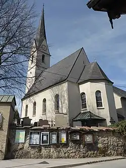 Die spätgotische Pfarrkirche mit schlichtem Langhaus, steilem Satteldach und Westturm entstand 1516 bis 1519 unter Fürsterzbischof Leonhard von Keutschach im Stil der Gotik und wurde am 6. Mai 1519 von Berthold Pürstinger, Bischof von Chiemsee, geweiht. Vermutlich wurde dabei älteres Mauerwerk wiederverwendet. Der Marmoraltar stammt aus dem Jahr 1774. Von 1952 bis 1956 wurde nördlich an die Kirche anschließend ein monumentalistischer Saalbau mit Betongroßfiguren von Heiligen über dem Hauptportal errichtet.