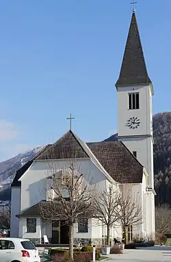 Der Friedhof liegt im Südosten nahe der Kirche. Er wurde im Jahr 1928 angelegt. Das Pfarrheim und das Pfarrerhaus sind aus den Jahren 1956 und 1965. 2007 und 2008 erfolgte ein Umbau und die Neugestaltung des Kirchenplatzes.[2]