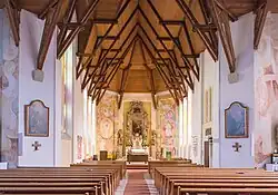 Die Fresken wurden vom Maler Franz Kohler im Jahr 1995 gemalt. Links des Hochaltares sind „Szenen aus der Offenbarung des Johannes“ und auf der rechten Seite „Christus als Mitte von Erschaffung und Vollendung der Welt“ dargestellt.[4]