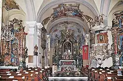 Das Altarbild des barocken Hochaltars mit Opfergangsportalen zeigt den Sturz Lucifers durch den Erzengel Michael. Assistenzfiguren sind links Johannes der Täufer und der Apostel Petrus, rechts die Apostel Paulus und Andreas. Die Figurengruppe im Aufsatz stellt die Marienkrönung dar. Der Altar geht optisch in die Ausmalung der Apsis über.