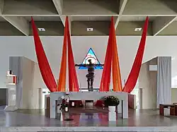 Der Altar besteht aus hochwertigem, weißem Marmor und hebt sich optisch vom restlichen Kirchenboden aus Kopfsteinpflaster ab. Die Sakristei befindet sich unter dem Altarraum. Die Gestaltung des Bodens mit einfachen Pflastersteinen führte zu heftigen Diskussionen mit dem Bischof, da dieser mit einem solch unedlen Boden nicht einverstanden war. Josef Lackner setzte seine Vorstellung durch, doch er musste auch Kompromisse eingehen. Er hatte zum Beispiel ursprünglich geplant, den Chor hinter dem Altar in eine Senke zu positionieren, sodass er nur vom Priester, aber nicht von den übrigen Besuchern gesehen wird. Aufgrund der Akustik stellte man den Chor dann aber doch direkt neben den Altar.
