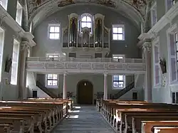 Das Kircheninnere zeigt einen einheitlich gestalteten dreijochigen großen Saal, das mittlere Joch ist verbreitert und mit einer Flachkuppel überwölbt, das Chor- und Westjoch sind mit böhmischen Kappen überwölbt, die korbbogigen Gurtbögen ruhen auf Wandpfeilern mit Pilastervorlagen. Das kurze westliche Emporenjoch ist mit einer Stichkappentonne überwölbt, die Empore steht auf korinthischen Säulen. Die je drei rechteckigen Jochfenster haben über einem durchlaufenden Gesims Oberlichtfenster.