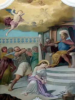 Im Scheitel des Triumphbogens ist das Allerheiligste Sakrament in der Monstranz dargestellt, das von den hll. Juliana von Lüttich, Alfons von Liguori und Thomas von Aquin verehrt wird. Darunter stehen rechts Vertreter der geistlichen Stände: Papst, Kardinal, Bischof, Pfarrer und Ordensleute und links Repräsentanten weltlicher Stände: ein Fürst, der ein Gotteshaus stiftet, ein Baumeister, der es errichtet, ein Dichter, ein Bauer, ein Soldat und eine Mutter mit Kind.