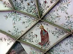 Am Gewölbe des Langhauses sind die 15 Rosenkranzgeheimnisse dargestellt, wobei um ein zentrales Motiv die vier weiteren gruppiert sind. Beim schmerzhaften Rosenkranz vor der Orgel sind um die Kreuzigung Christi sein Blutschwitzen am Ölberg, seine Geißelung, die Dornenkrönung und die Kreuztragung angeordnet. Der glorreiche Rosenkranz zeigt um die Sendung des Heiligen Geistes die Auferstehung Christi, die Himmelfahrt Christi, die Aufnahme Mariens in den Himmel und die Krönung Mariens. Beim freudenreichen Rosenkranz vor dem Chorbogen steht die Geburt Christi im Mittelpunkt, umgeben von der Verkündigung, dem Besuch bei Elisabeth, der Darstellung des Herrn und der Auffindung Jesu im Tempel. Der Bogen über der Orgelempore zeigt seitlich die hl. Cäcilia und König David als Patrone der Kirchenmusik sowie musizierende Engel.