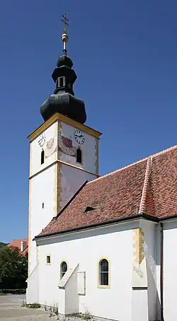 Die Pfarrkirche liegt im Westen des alten Dorfkernes, gleich in der Nähe des Heiligenkreuzer- und des Lilienfelderhofes. Vom ehemals umgebenden Friedhof sind nur noch wenige Mauerreste übrig. Die Kirche ist eine zweijochige, romanische Saalkirche mit spätgotischen Kreuzrippengewölben und eingezogenem zweijochigem Chor mit spätbarocken Platzlgewölben und korbbogenförmiger Apsis. Im Westen befindet sich ein spätgotischer Kirchturm mit einer barocken Zwiebelhaube, die 1834 erneuert wurde. Im Norden ist ein Oratorium und die Sakristei angebaut.