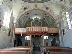 Das Kircheninnere zeigt ein Langhaus mit der Barockisierung von 1718, die gotischen Runddienste sind durch Wandpfeiler ersetzt, die Rippen des Netzrippengewölbes sind abgeschlagen. Die zweigeschoßige Westempore hat eine geschwungene Brüstung. Der einjochige Chor mit einem Fünfachtelschluss hat ein Sternrippengewölbe mit abgeschlagenen Rippen, hinter dem Hochaltar sind beim Achsenfenster zwei gotische Runddienste erhalten, sonst sind die Runddienste durch barocke Wandpfeiler ersetzt. In der Südwand des Chores ist der Zugang zur Sakristei als ehemalige Michaelskapelle, der Raum ist kreuzrippengewölbt mit ringförmigen Schlusssteinen und es gibt weiters eine kreuzgratgewölbte Unterkirche.